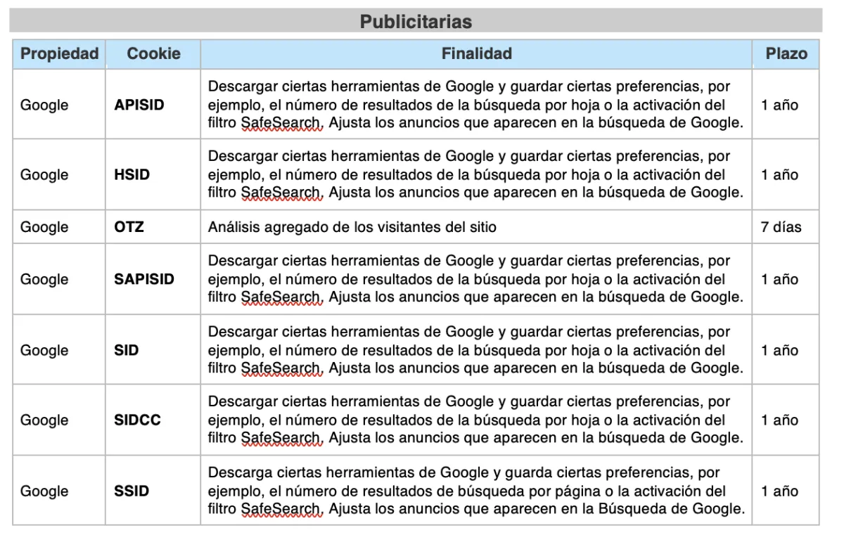 Cookies publicitarias: son aquellas que permiten la gestión, de la forma más eficaz posible, de los espacios publicitarios que, en su caso, el editor haya incluido en una página web, aplicación o plataforma desde la que presta el servicio solicitado en base a criterios como el contenido editado o la frecuencia en la que se muestran los anuncios.